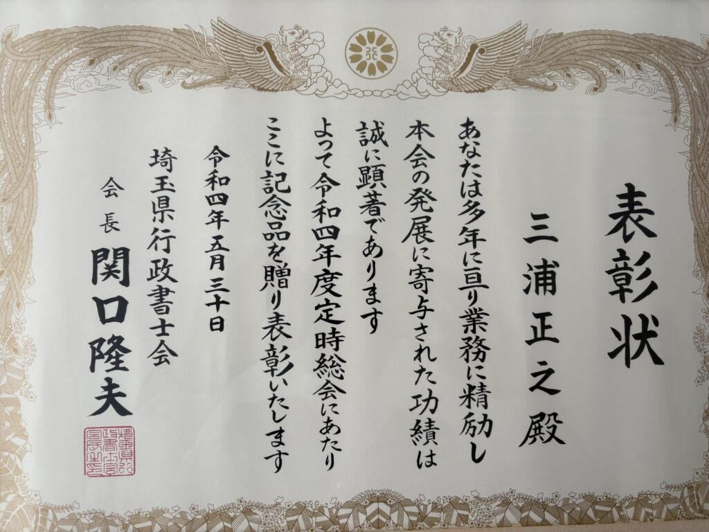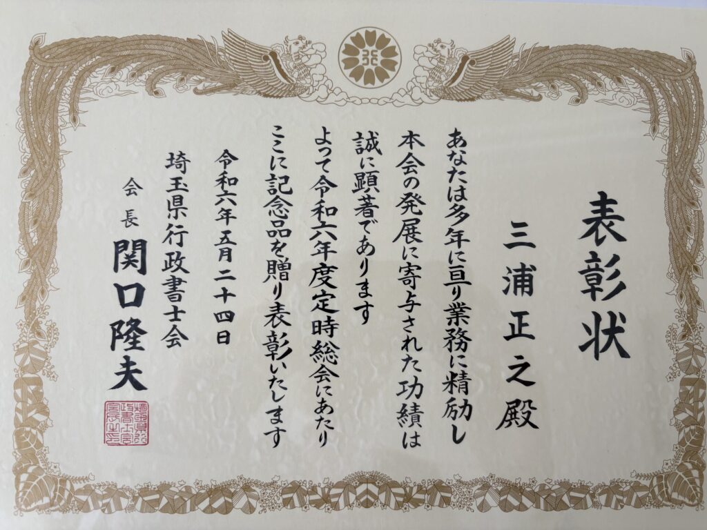 15年以上の実務経験があり他の会員の模範となる者として、埼玉行政書士会より行政書士 三浦事務所が表彰されました…